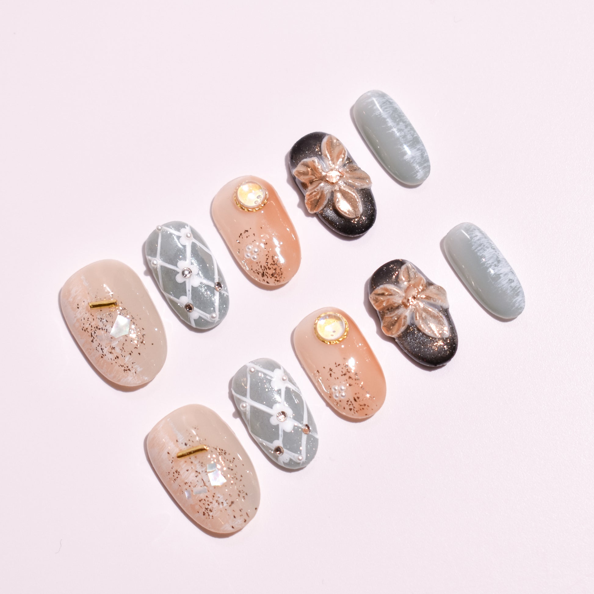 The palette combines warm nude beige, soft sage green, and charcoal black shimmer, accented by gold foil flecks, pearlescent studs, and a standout hand-sculpted metallic floral centerpiece. Delicate lattice detailing and subtle texture layers add depth without overwhelming the design, creating a balanced mix of softness and structure.