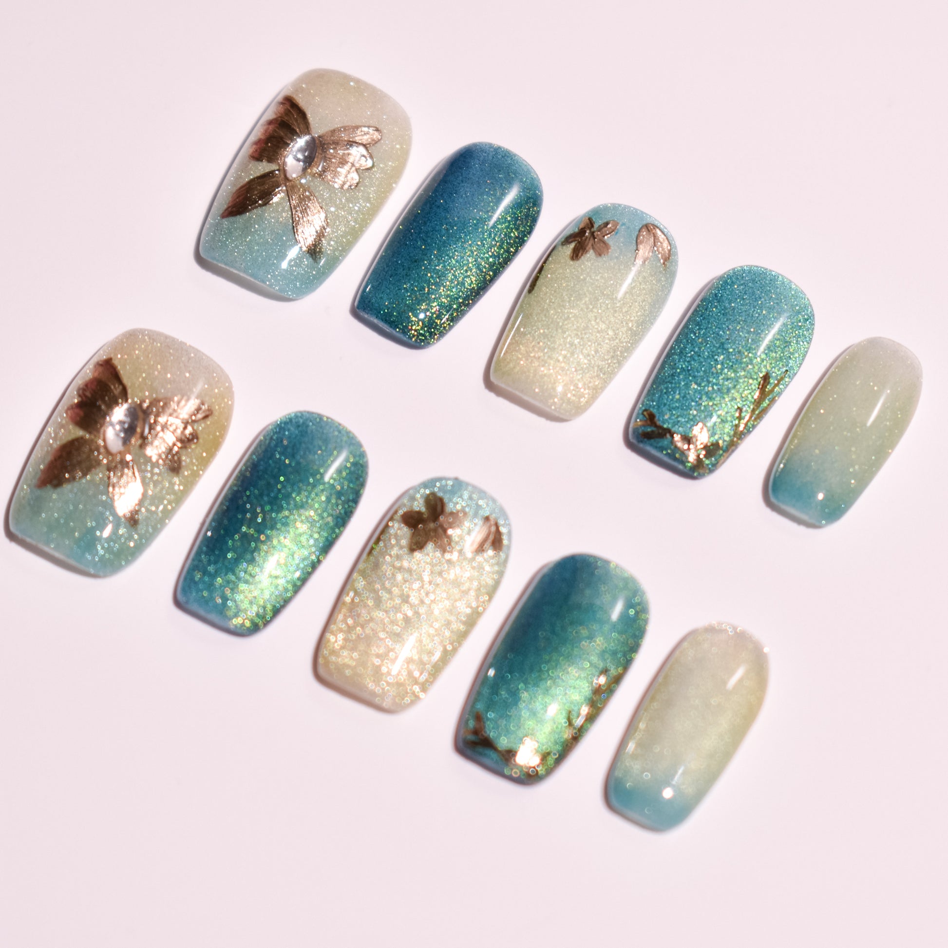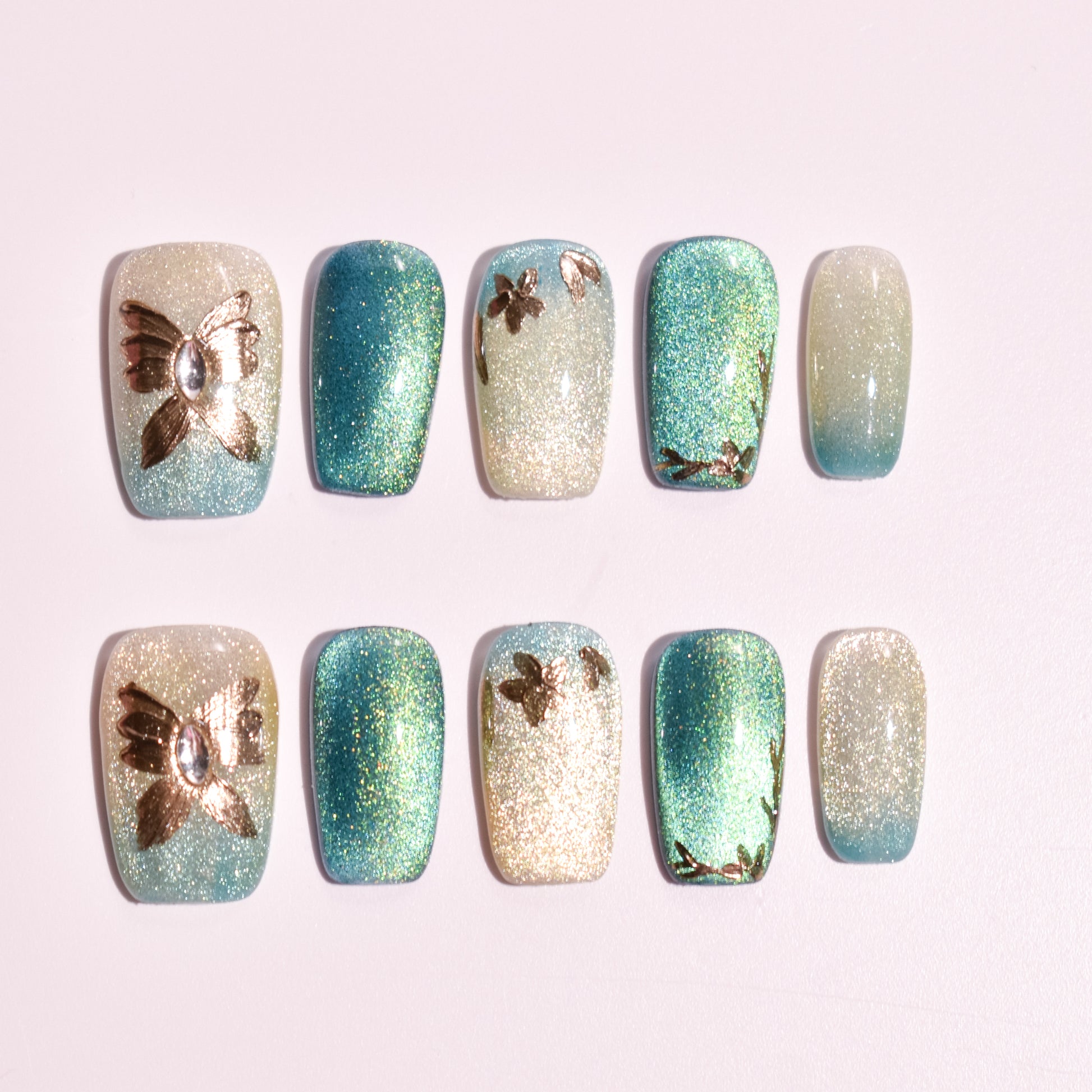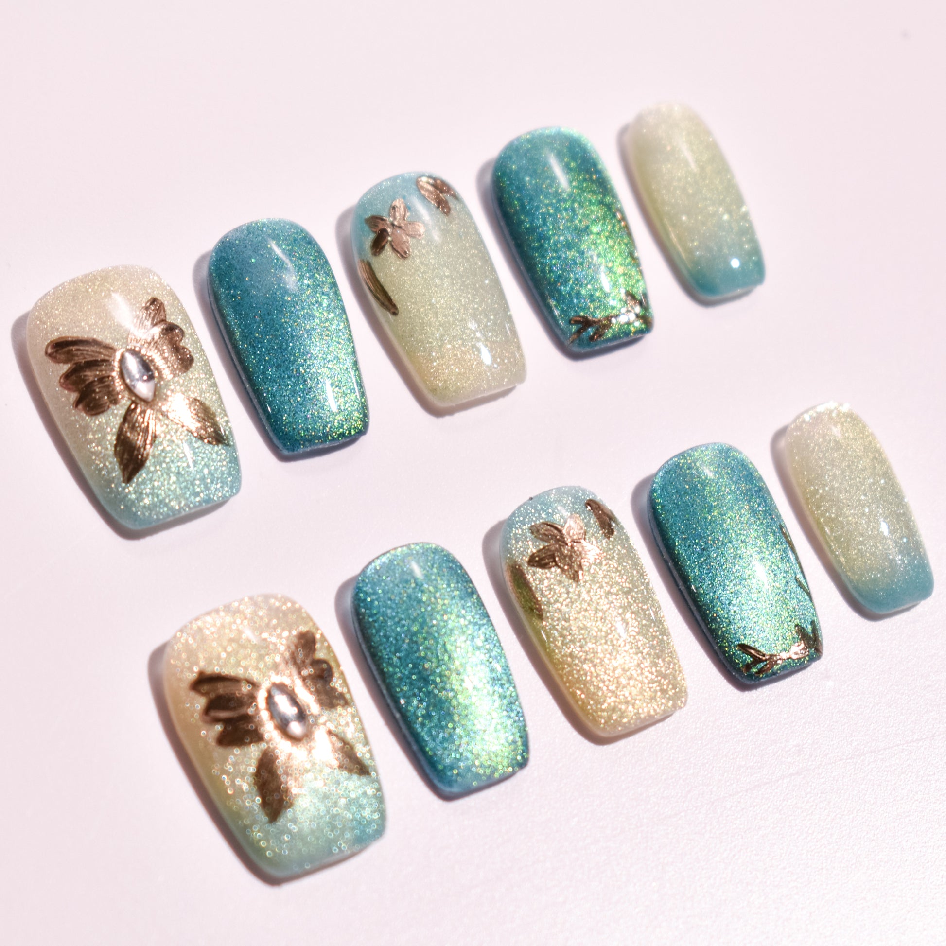 Verdant Glow is a handcrafted medium square press-on nail set inspired by fresh botanicals, oceanic greens, and luminous gold accents.