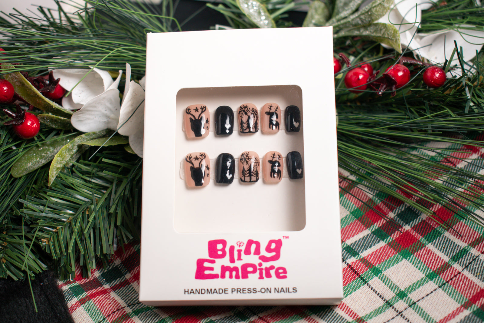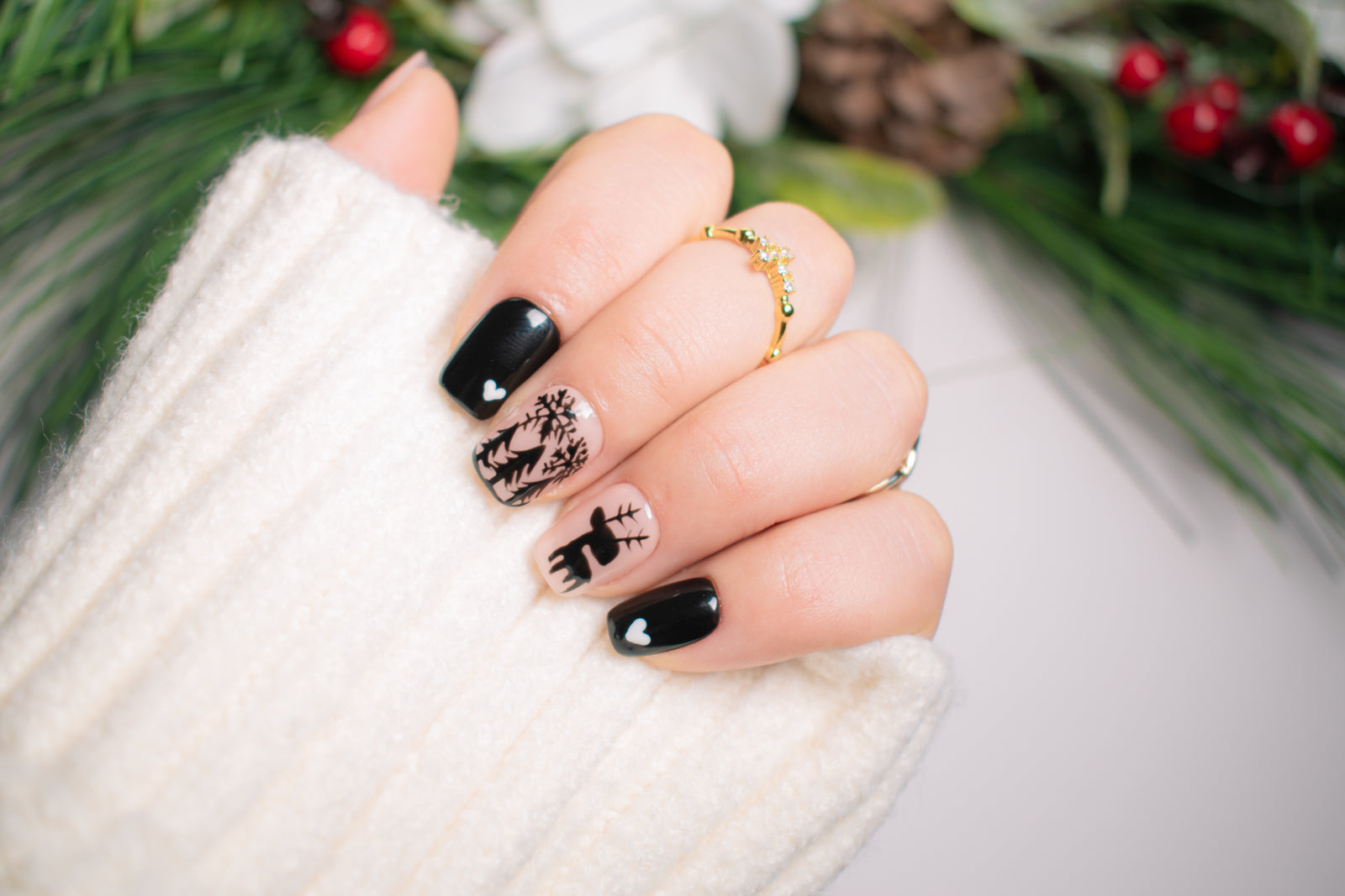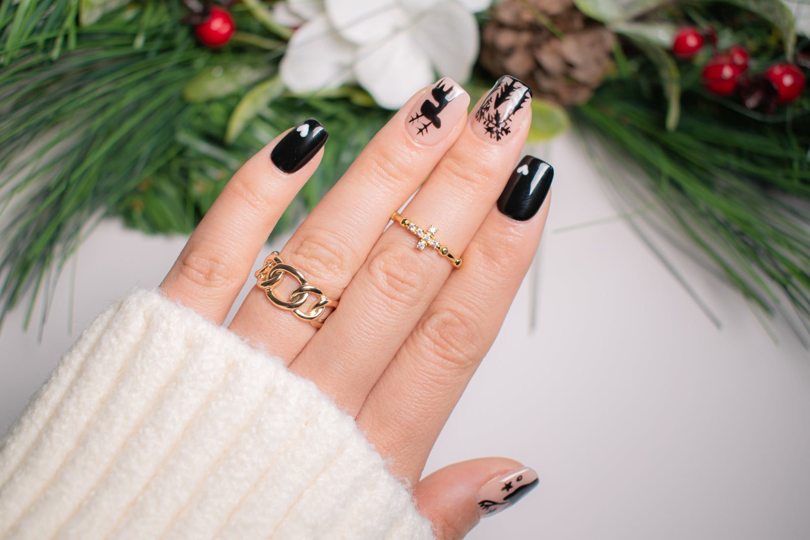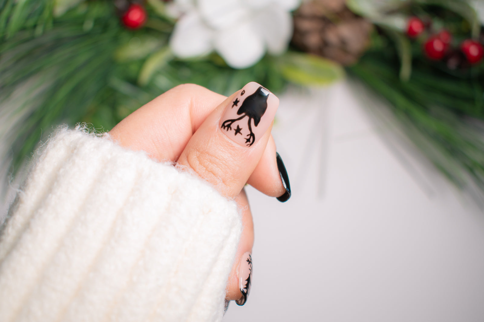 Step into a serene winter night with Winter Forest. Featuring hand-painted silhouettes of stags, trees, and delicate stars, these nails create a cozy, mystical atmosphere perfect for the colder months. The contrast of soft nude and bold black makes this set a true standout for any occasion.