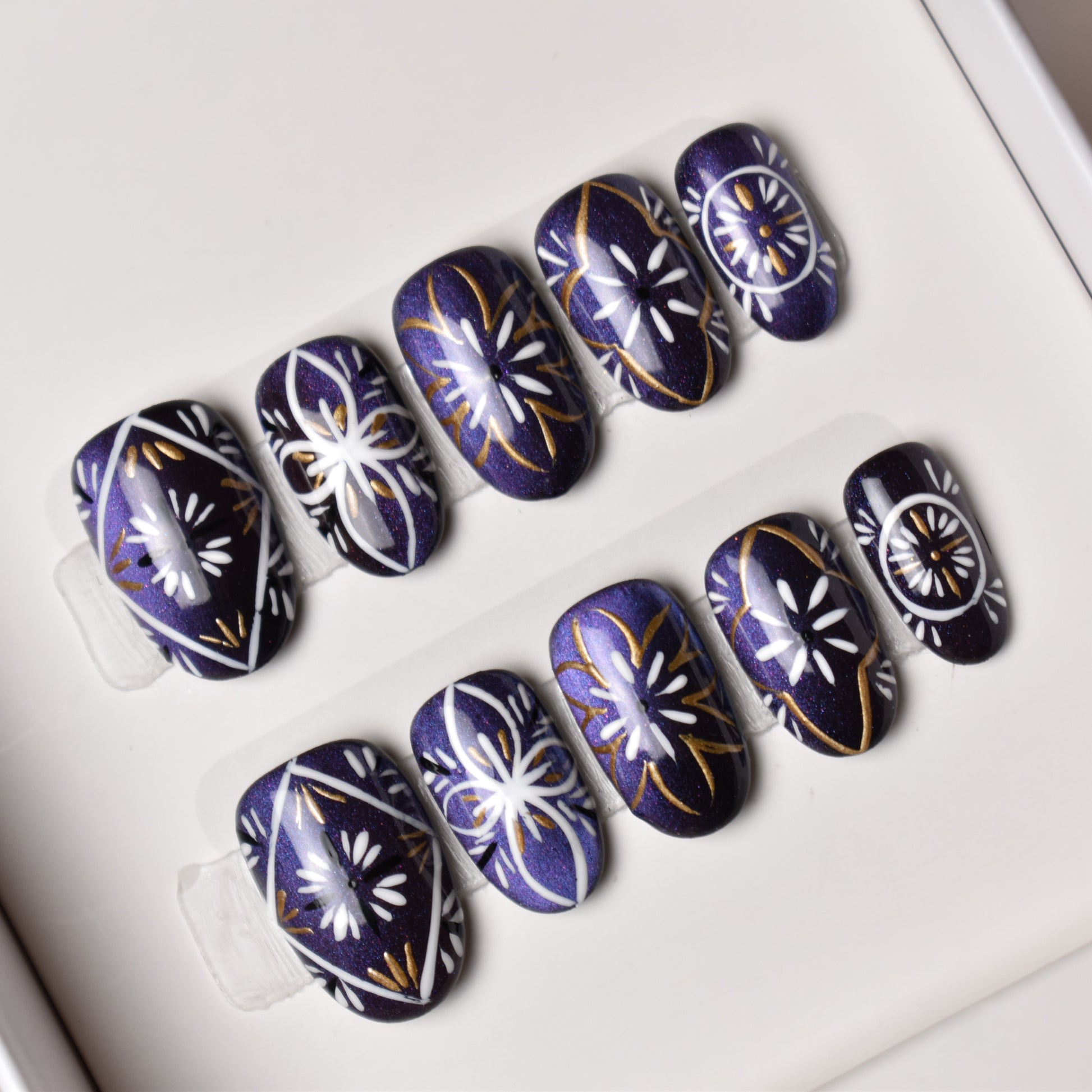 - 10 uniquely designed, hand-painted press-on nails made with high-quality UV gel.