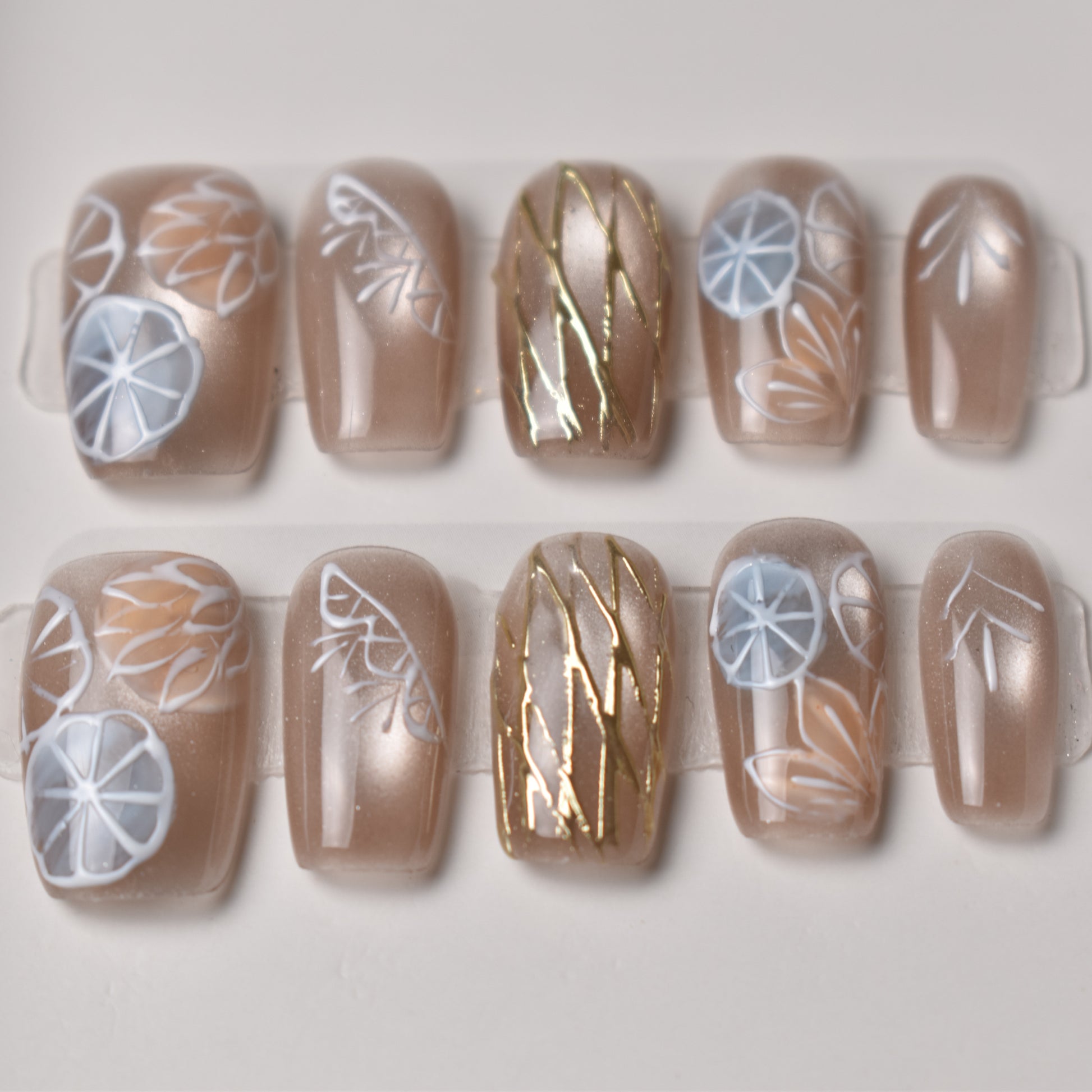 - 10 uniquely designed, hand-painted press-on nails made with high-quality UV gel.